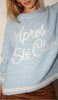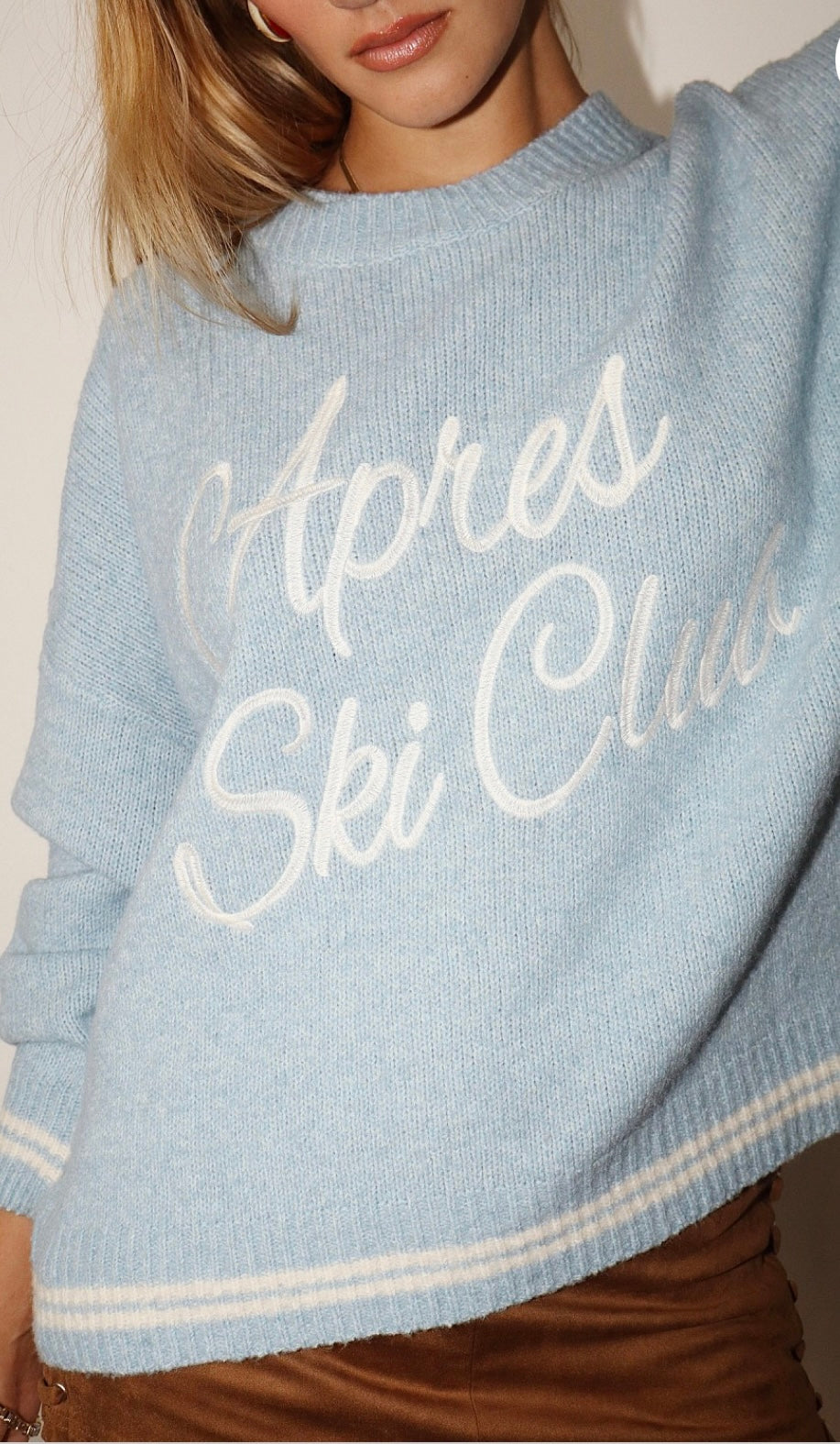 Cold day? Ski day? Or just sipping cocoa on the couch—this sweater nails the vibe. In the dreamiest powder blue knit with “Après Ski Club” embroidered across the front, it feels like that perfect mix of cozy + chic. The relaxed fit and striped trim details give it a vintage ski-lodge charm, while the soft knit keeps you snuggled in comfort no matter where you’re headed.