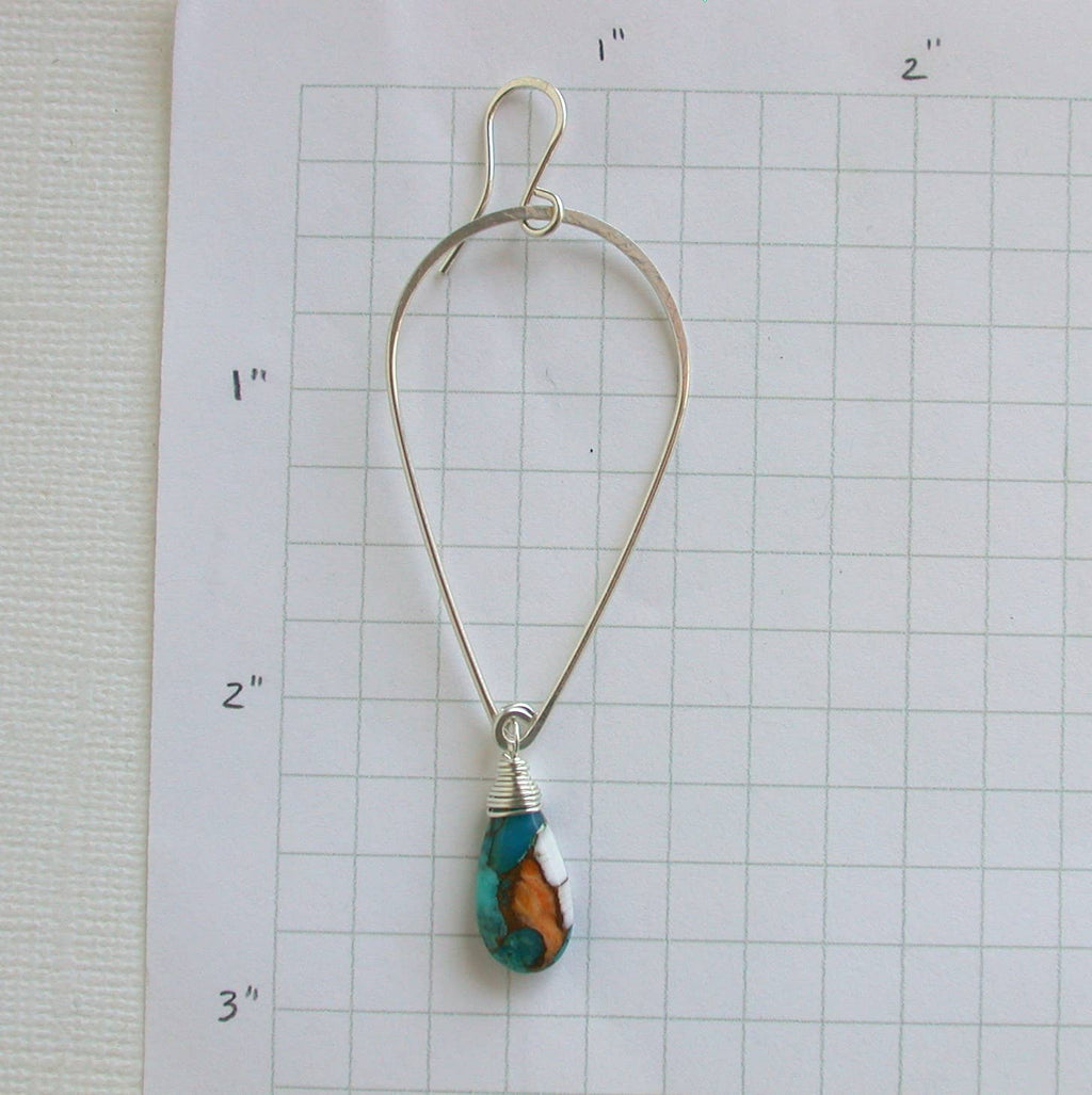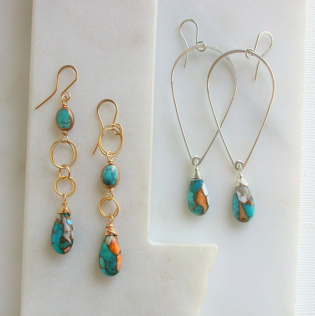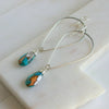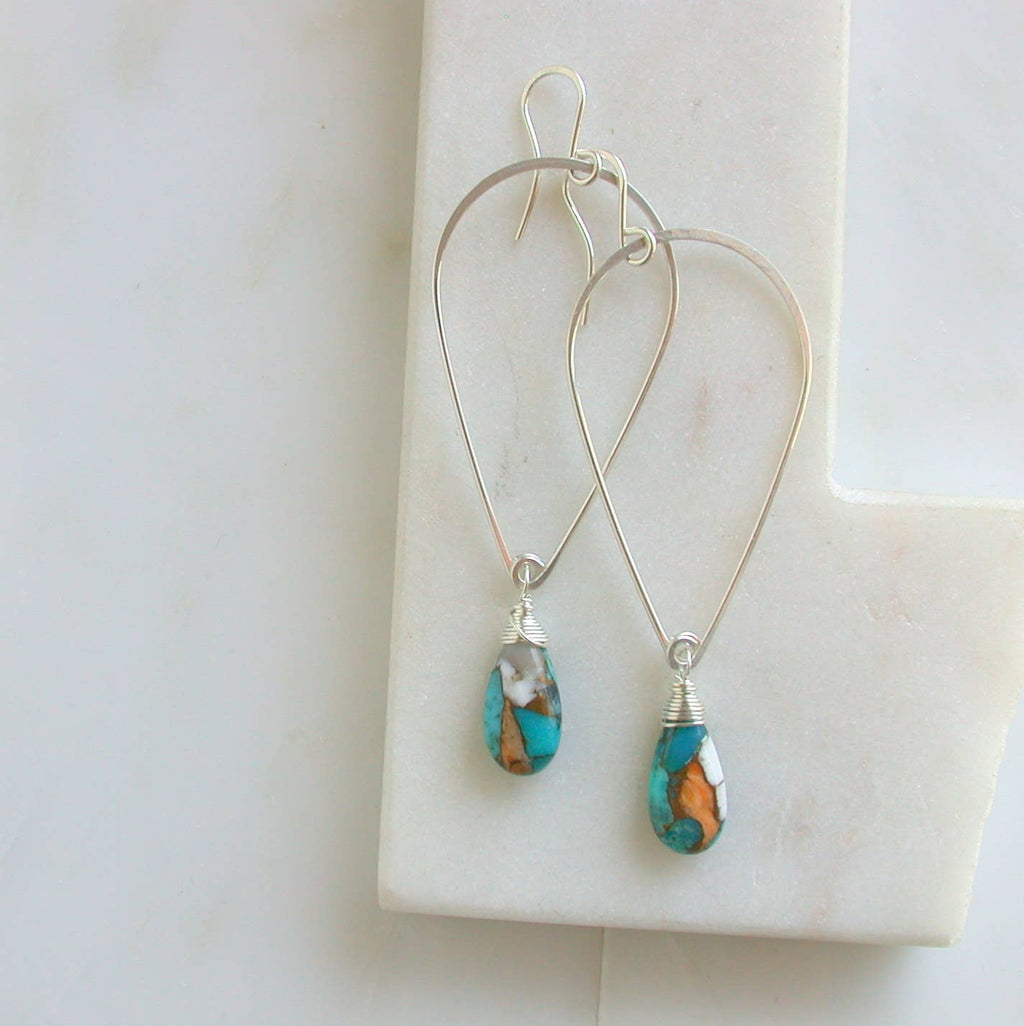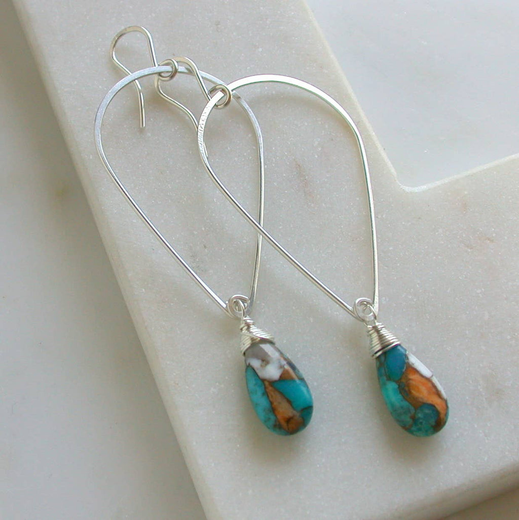 These Oyster Turquoise Drops feature natural turquoise stones suspended from elegant inverted sterling silver teardrops. Lightweight and swingy, they offer vibrant color and a distinctive design, expertly handcrafted with meticulous attention to detail for a refined, artisanal finish.