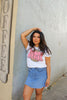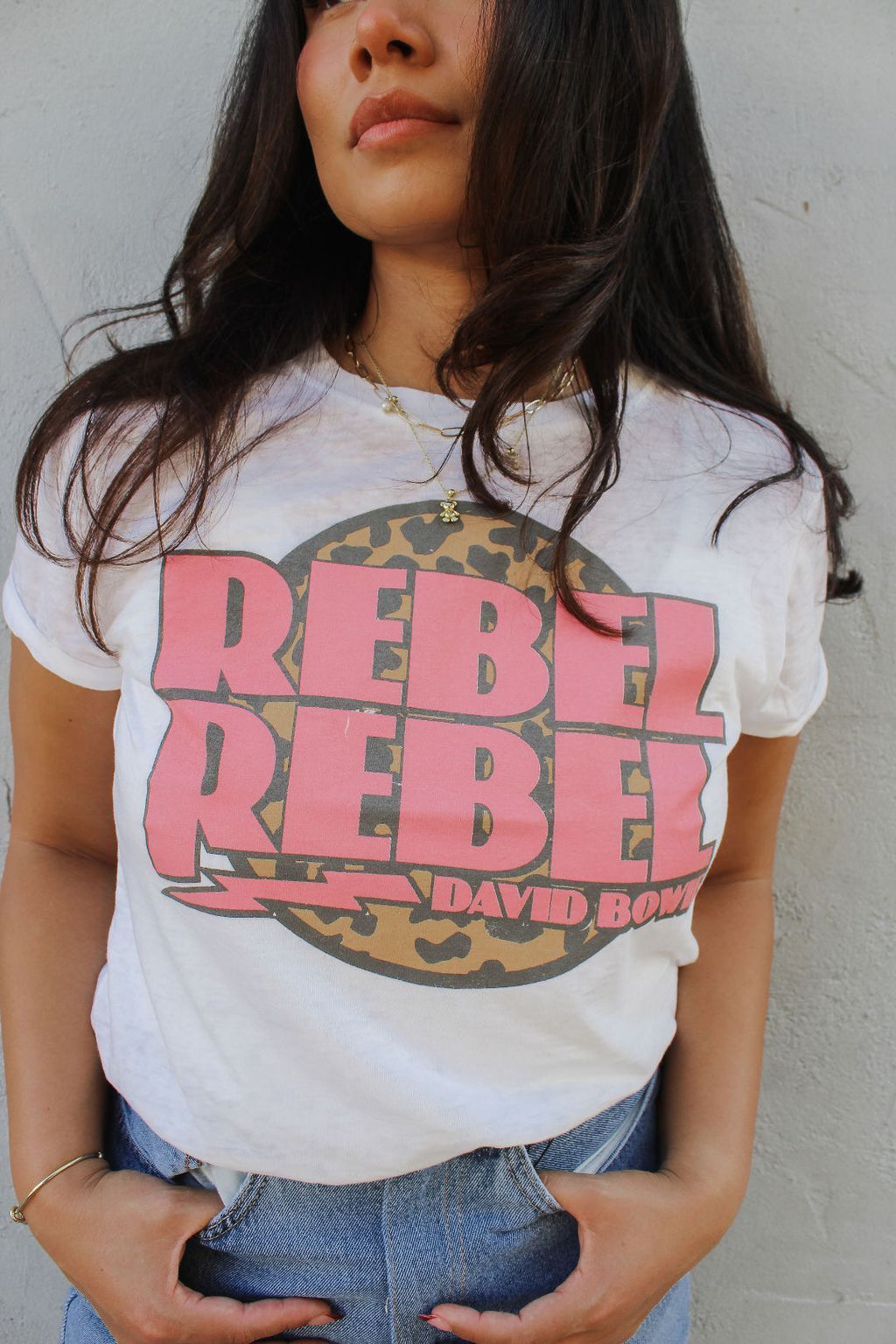 Our “Rebel Rebel” tee will have you singing with style. Showcasing a slightly worn David Bowie lightning bolt in vibrant red with a fierce cheetah print, this shirt brings a fun, bold splash to any look. Crafted from luxuriously soft, washed-down cotton, it features cuffed sleeves, a ribbed crew neck, and a sleek fitted shape for the perfect playful edge.