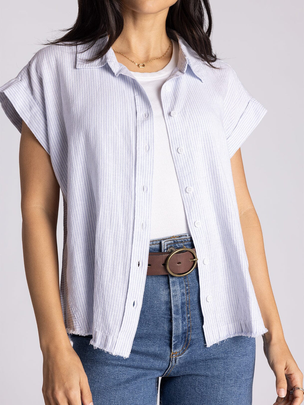 The relaxed fit, cap sleeves, and easy button-front make it perfect worn open over a tank, half-tucked with linen pants, or buttoned up for a clean, coastal-cool vibe.