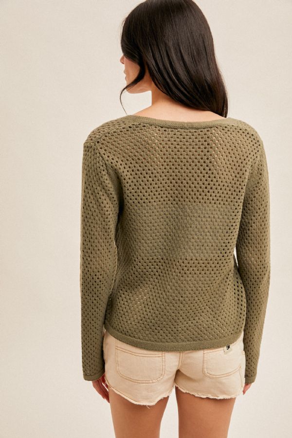 The ultimate lightweight layer you’ll reach for again and again. This open-knit cardigan comes in a soft olive green with a breezy, crochet-style weave and an easy tie-front closure. Long sleeves and a relaxed fit give it that effortless, lived-in feel, while the peek-through texture makes it perfect for layering over tanks, camis, or even bralettes.