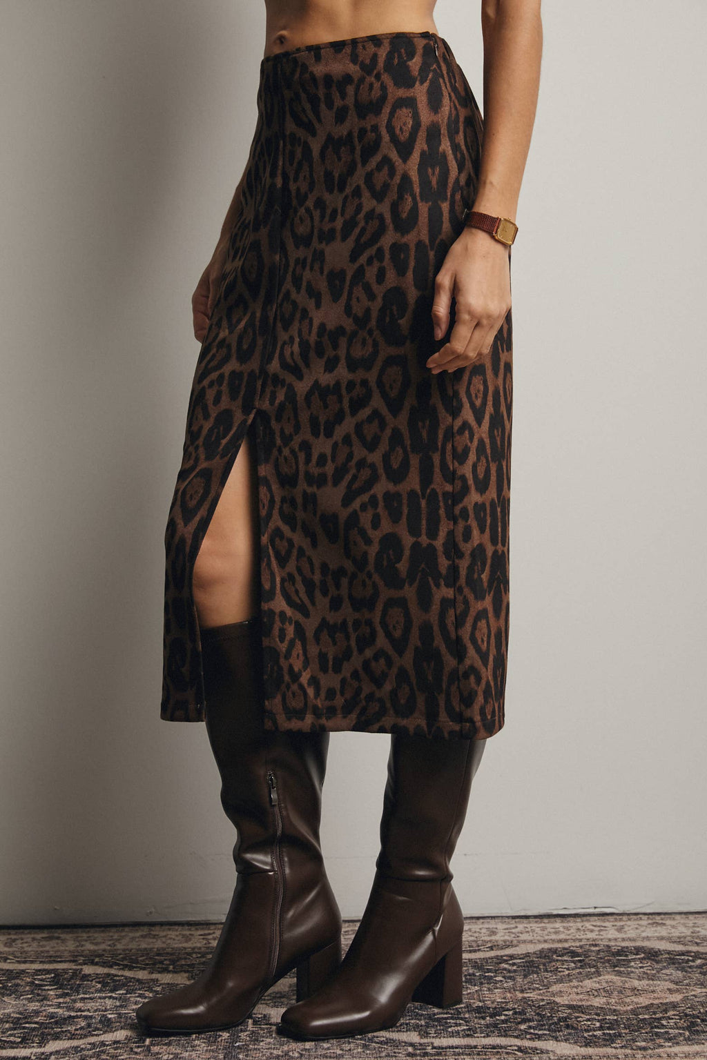 This deep, moody leopard print brings instant boss energy without trying too hard. The stretch-woven fabric glides over your curves with that smooth, brushed finish that looks luxe up close and even better in motion. The sleek midi cut keeps things elevated, while the front slit throws in just enough sass to make people wonder if you planned to stop traffic today (you did).