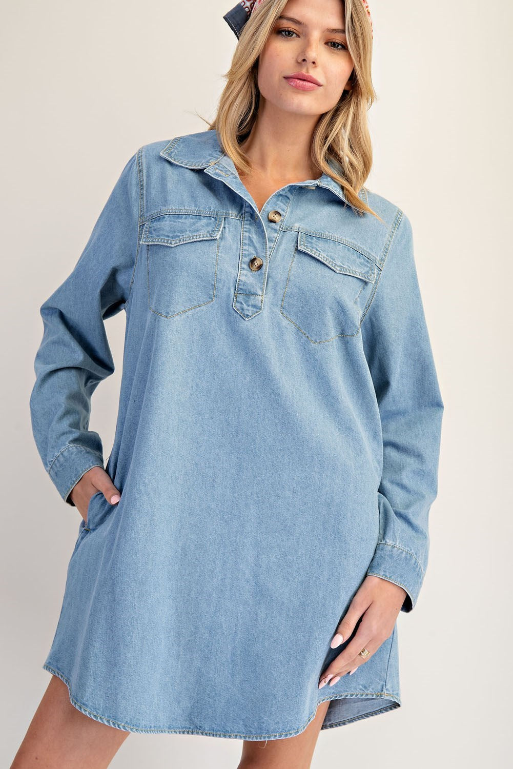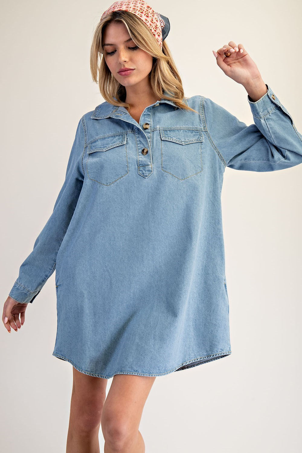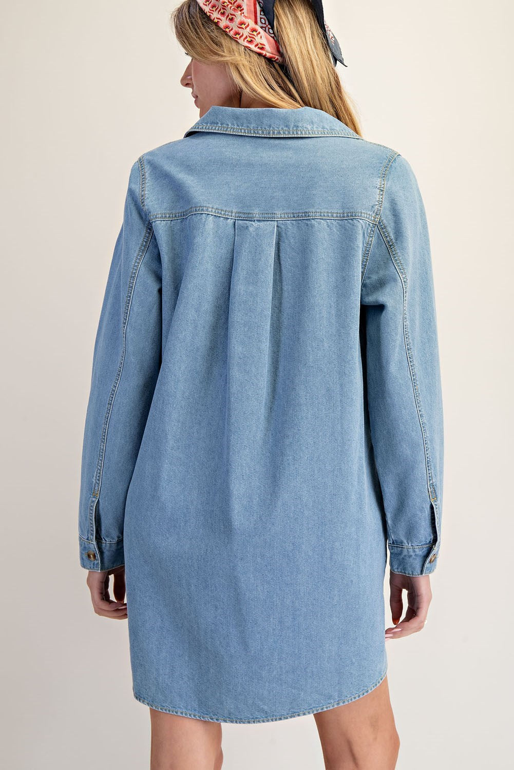 The easiest outfit ever? Found it. This light wash denim shirt dress is that effortless “throw it on and look cute” piece your closet has been missing. Featuring a relaxed fit, button-front placket, and chest pockets for a touch of vintage vibe, it’s comfy enough for all-day wear but still put-together.