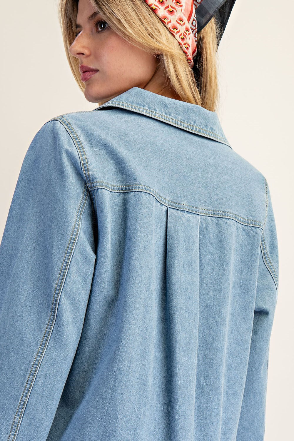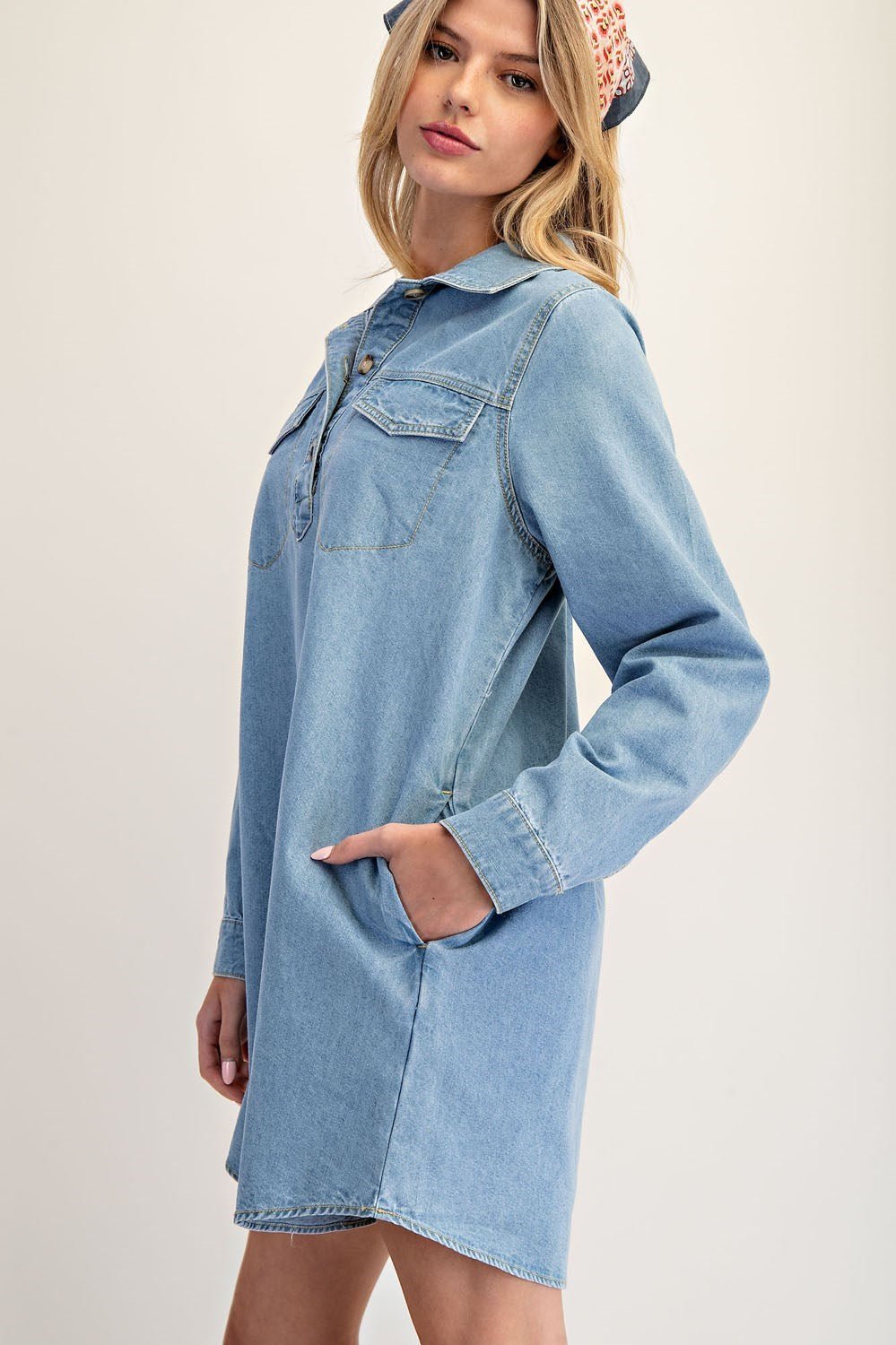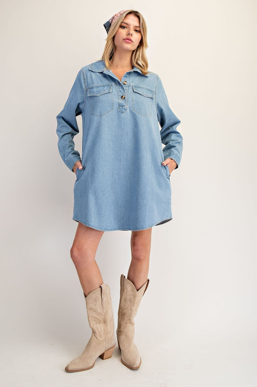 The easiest outfit ever? Found it. This light wash denim shirt dress is that effortless “throw it on and look cute” piece your closet has been missing. Featuring a relaxed fit, button-front placket, and chest pockets for a touch of vintage vibe, it’s comfy enough for all-day wear but still put-together.
