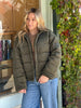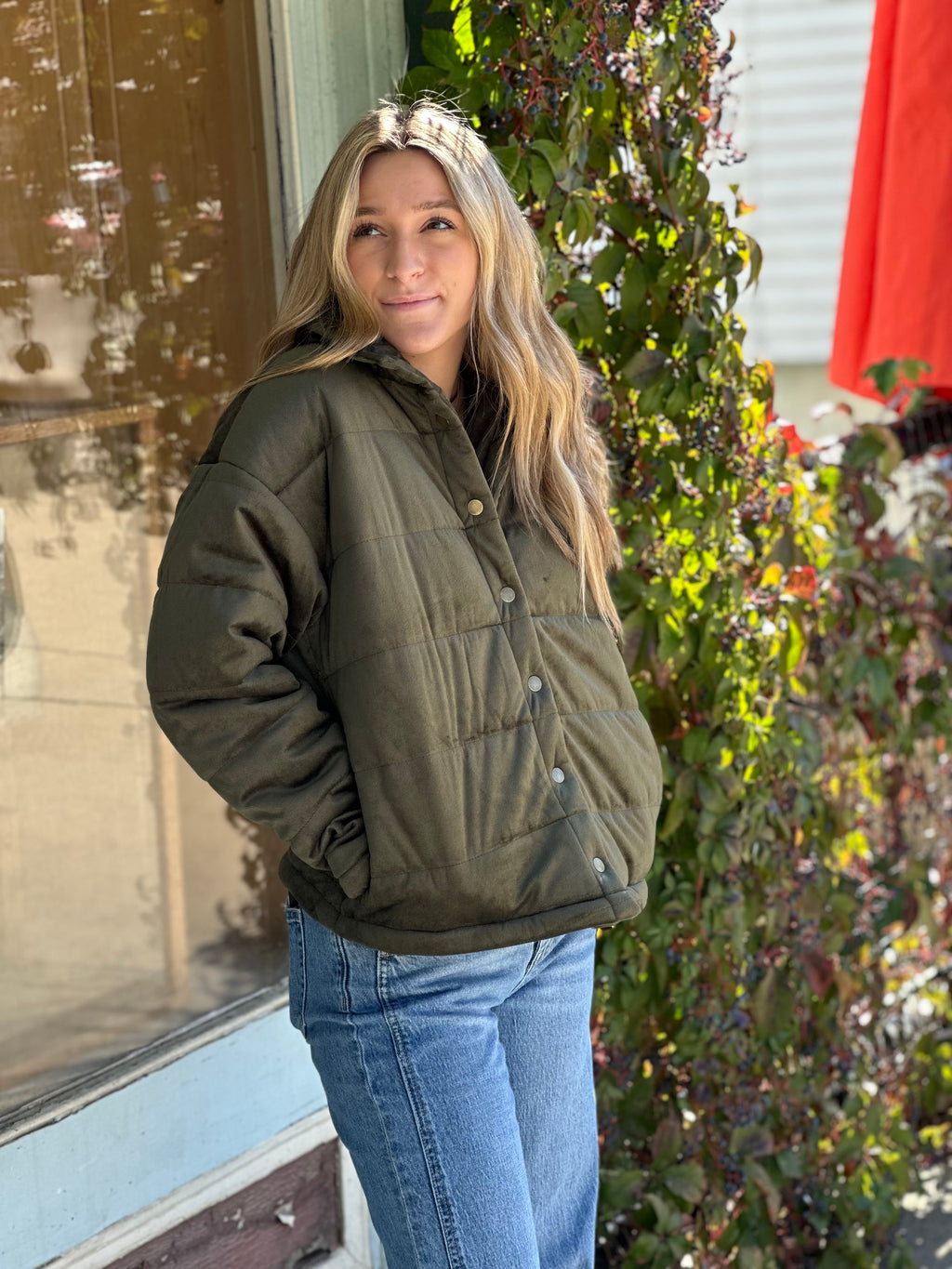 Wrap yourself in all the plushy goodness with this luxe velvet puffer jacket. Designed in a rich olive hue, it’s where cozy comfort meets elevated cool. The padded silhouette keeps you warm without the bulk, while the snap button front and relaxed fit make it effortlessly chic for layering over your favorite tees, knits, or even dresses. A total main character in fall moment. 🍂