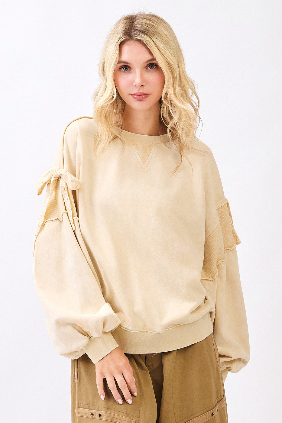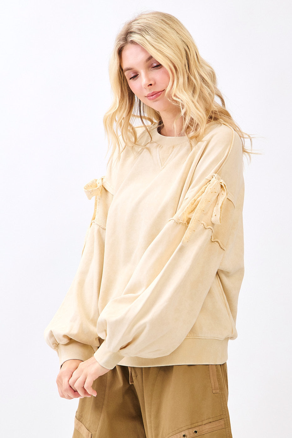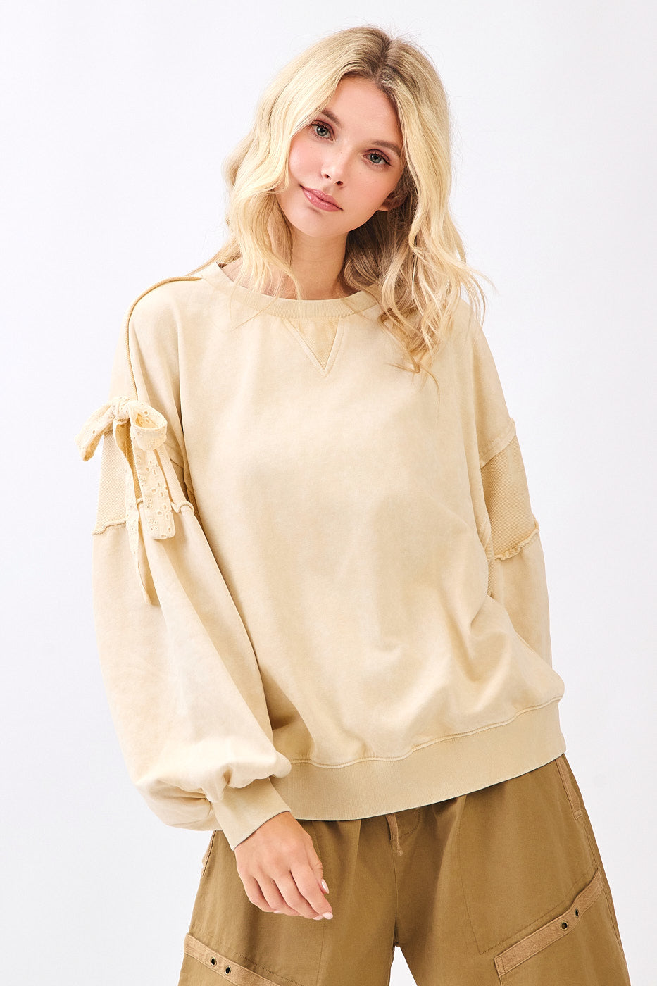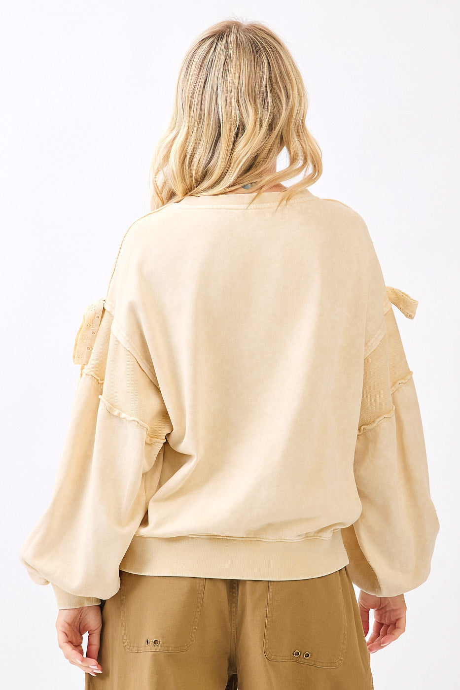 Bow Appliqué Washed Balloon Sleeve Sweatshirt
