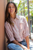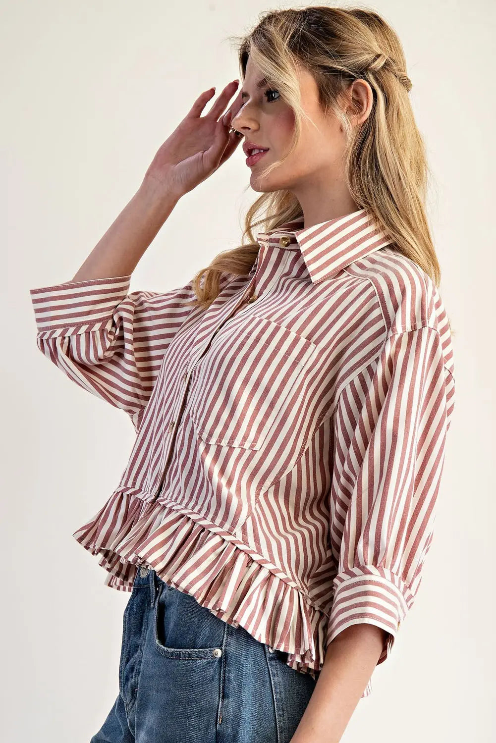 This playful button-up features a collared neckline and a charming ruffle hem that adds a flirty twist to a classic silhouette. The drop shoulder design with button cuffs brings relaxed comfort while keeping it stylish. Perfect for adding a fun, feminine touch to your everyday wardrobe.